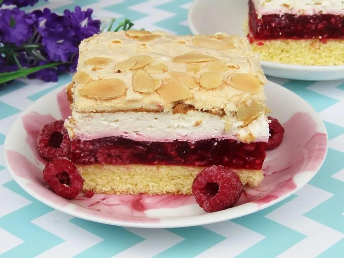 Malinowa chmurka to wyjątkowy deser, który zachwyca nie tylko smakiem, ale także wyglądem. Składa się z kruchego spodu, warstwy galaretki z malinami, kremu śmietankowego z mascarpone oraz chrupiącej bezy posypanej płatkami migdałów. Jego lekka, rozpływająca się w ustach konsystencja sprawia, że jest idealnym wyborem na różne okazje, od rodzinnych spotkań po eleganckie przyjęcia.